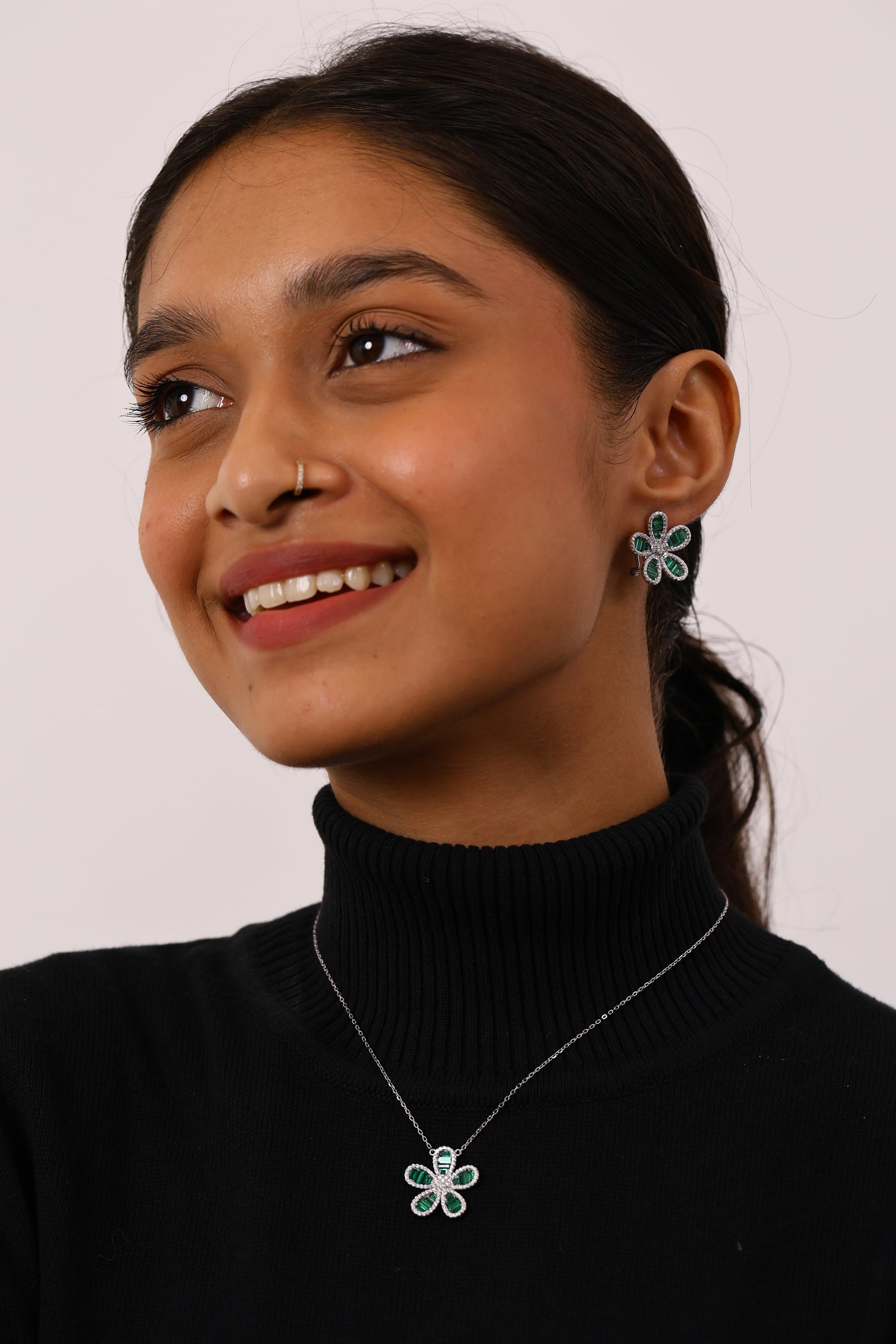 Emerald Flower Silver Pendant Set